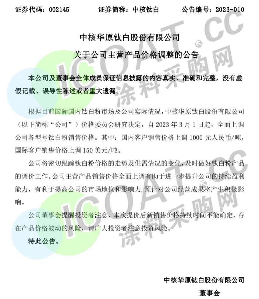 中核鈦白發布調價函,自3月1日起,上調各型號鈦白粉銷售價格。其中:國內客戶銷售價格上調1000元/噸,國際客戶銷售價格上調150美元/噸。