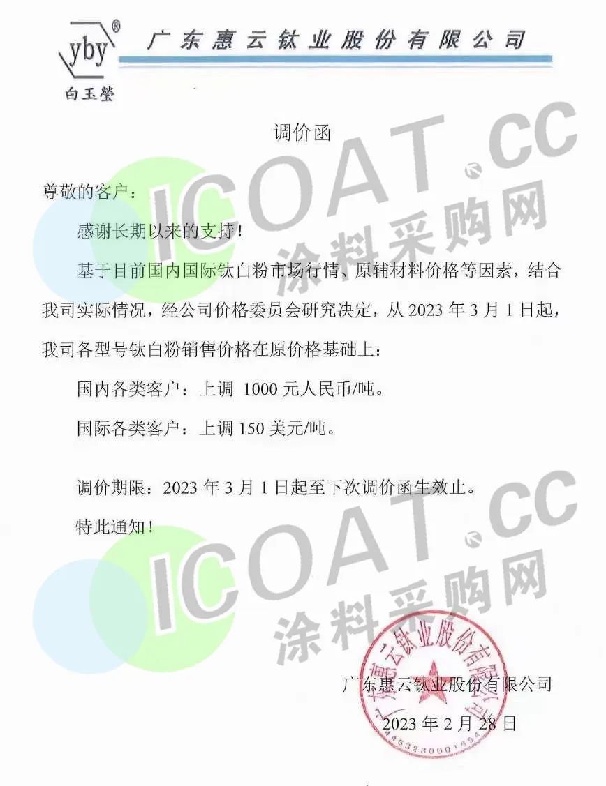 廣東惠云鈦業發布調價函,稱自3月1日起,在現有鈦白粉銷售價格基礎上調整公司各型號鈦白粉銷售價格。其中國內各類客戶銷售價格上調1000元/噸,國際各類客戶出口價格上調150美元/噸。