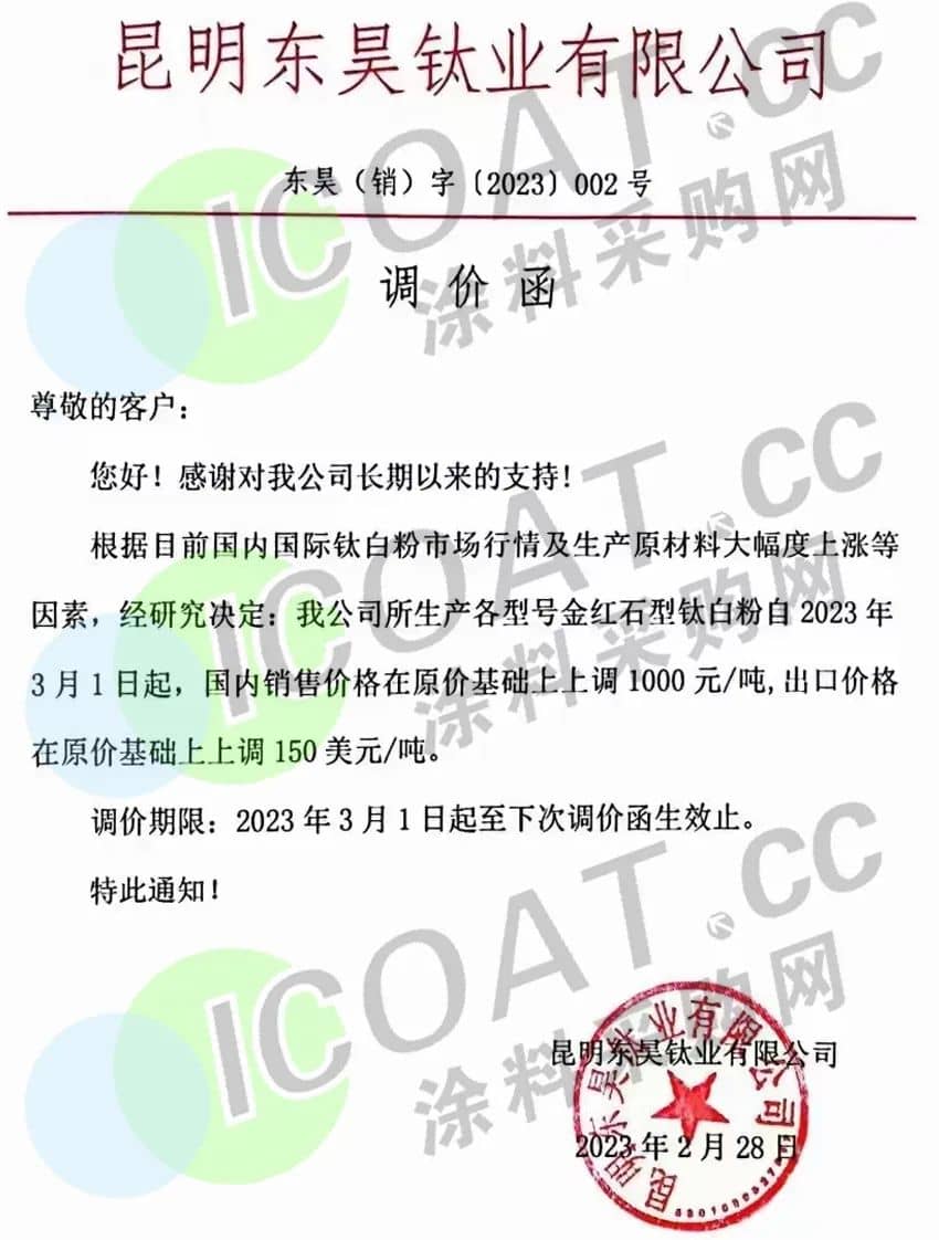昆明東昊鈦業發布調價函,稱各型號金紅石型鈦白粉自3月1日起,國內銷售價格在原價基礎上上調1000元/噸,出口價格在原價基礎上上調150美元/噸。