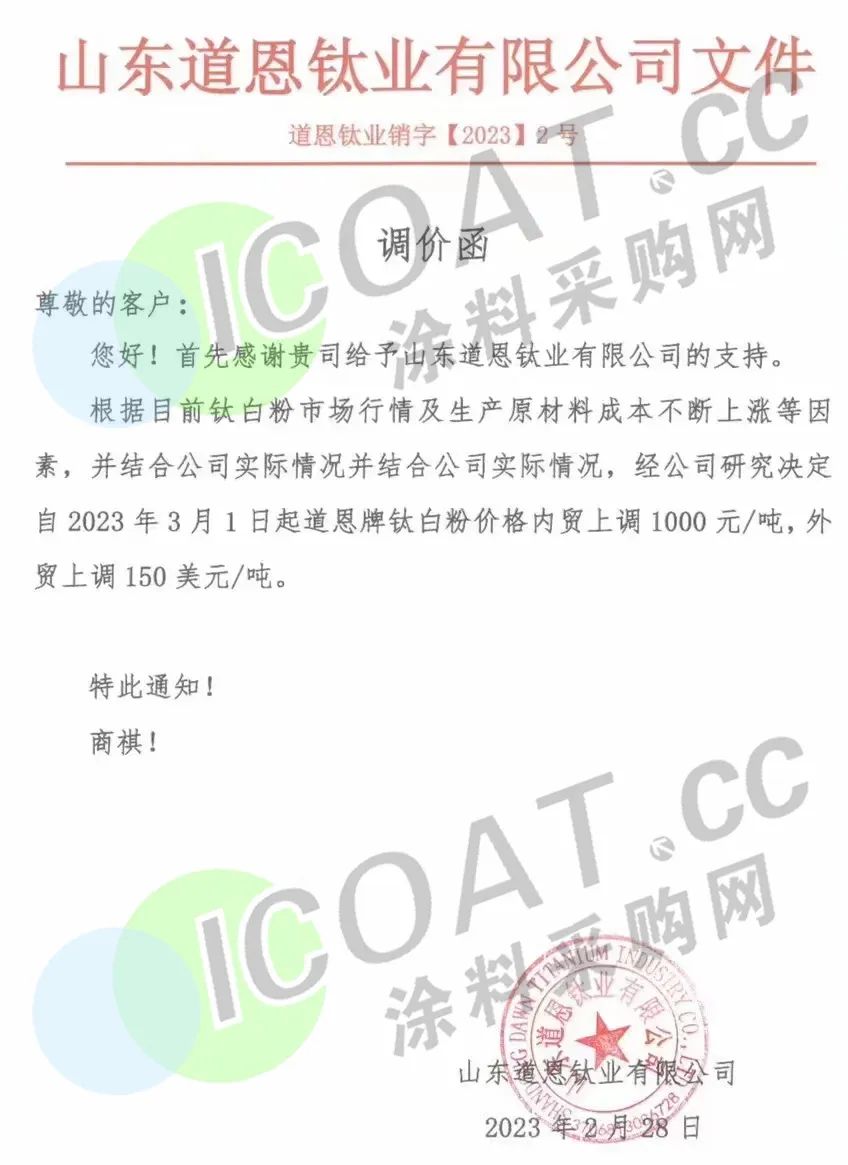 山東道恩鈦業發布調價函,稱經研究決定,自3月1日起道恩牌鈦白粉價格內貿上調1000元/噸,外貿上調150美元/噸。