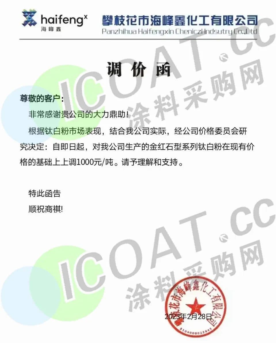 攀枝花市海峰鑫化工發函,稱即日起,金紅石型系列鈦白粉在現有價格的基礎上上調1000元/噸。
