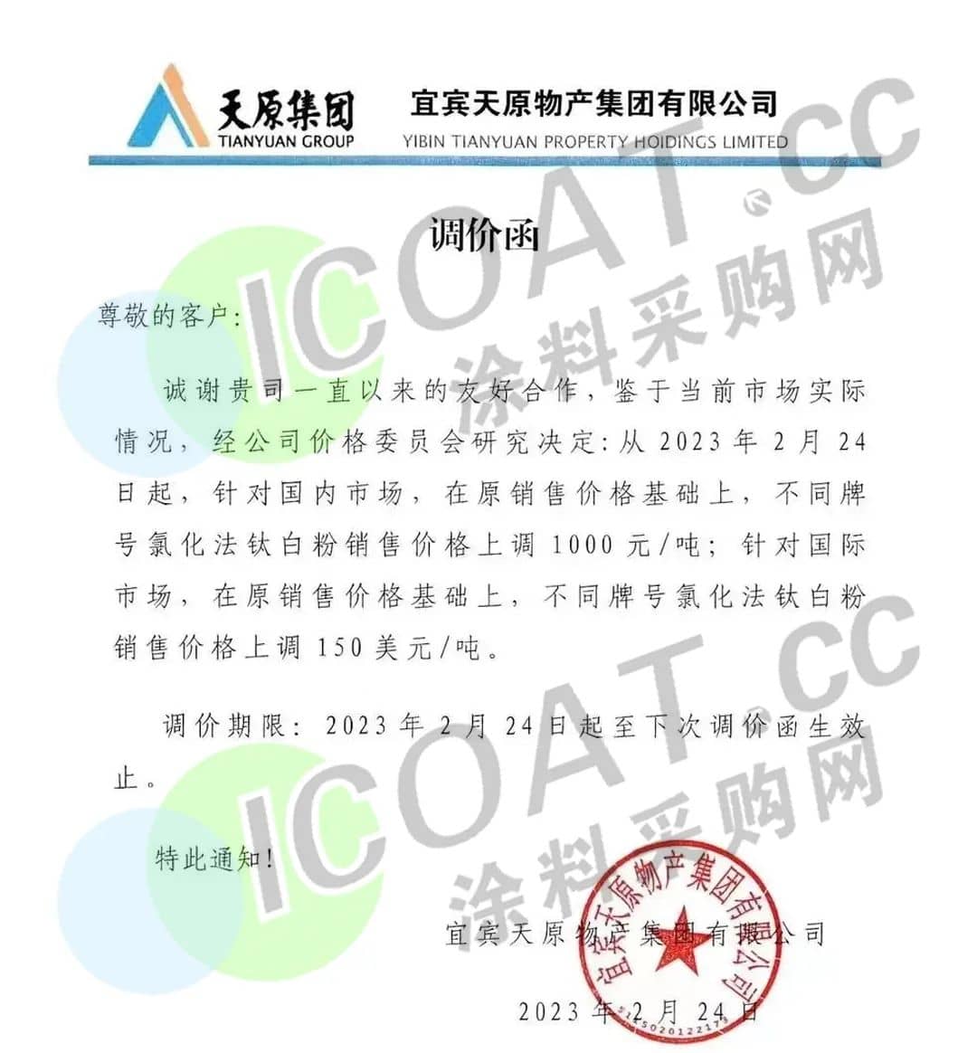 而在幾天前,天原集團發函宣布,國內市場不同牌號氯化法鈦白粉銷售價格上調1000元/噸,國際市場不同牌號氯化法鈦白粉銷售價格上調150美元/噸。
