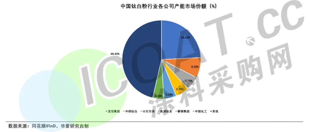 我國形成以龍蟒佰利聯、中核鈦白、山東東佳、金浦鈦業、攀鋼集團等大型集團為主的供給格局,以上五家鈦白粉產能占我國總產能的一半。其中,龍佰集團是唯一一個年產能超過60萬噸的企業,世界排名第三,亞洲第一。除此之外年產10萬噸鈦白粉以上的大型企業有10家,分別是:攀鋼鈦業、中核鈦白、中國化工、山東東佳、金浦鈦業、金海鈦業、寧波新福、山東道恩鈦業、廣西金茂鈦業和云南大互通。