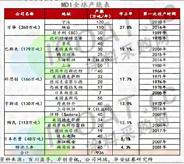 目前全球MDI行業集中度高,全球MDI廠家共計8家,其中產能主要集中在萬華、巴斯夫、科思創、亨斯邁、陶氏5家國內外化工巨頭中,5家廠商MDI總產能占比達到90.5%。從全球MDI企業產能來看,萬華化學擁有全球最大的MDI產能,其產能達到260萬噸/年,占全球總產能的27.8%;其次為巴斯夫,MDI產能達到179萬噸/年,占比達19.1%;科思創MDI產能為166萬噸/年,占比17.7%,位居第三。