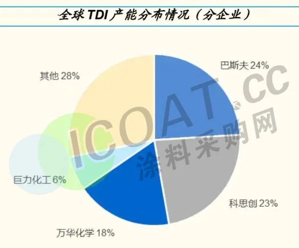 中國為世界上TDI產能最大的國家,約占全球TDI產能的40%。全球TDI行業呈現寡頭壟斷格局,CR4占比71%,其中,巴斯夫產能達86萬噸排名第一(24%),科思創產能83萬噸排名第二(23%),萬華化學產能65萬噸(18%)排名第三。