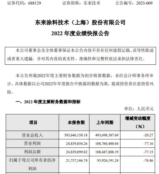 2022年度,公司營業(yè)利潤、利潤總額、歸屬于母公司所有者的凈利潤、歸屬于母公司所有者的扣除非經(jīng)常性損益的凈利潤、基本每股收益分別同比下降77.16%、77.15%、76.86%、91.86%、76.92%,主要系疫情影響,終端市場消費(fèi)需求不及預(yù)期,導(dǎo)致營業(yè)收入下降;上游原材料漲價(jià),導(dǎo)致成本上升;公司持續(xù)加強(qiáng)人才建設(shè)和市場開拓,導(dǎo)致費(fèi)用增加所致。