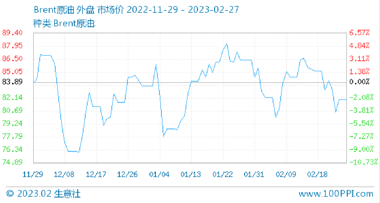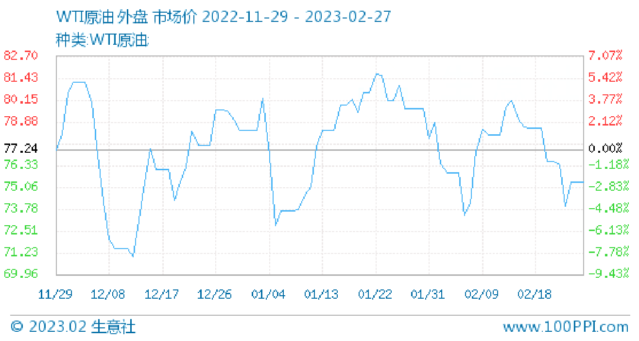 回顧近期原油走勢,因制裁、減產(chǎn)、不增產(chǎn)導致原油價格從2月10日大幅下行。截止2月27日,原油市場跌勢才有所緩和,其中:布倫特原油市價為81.95美元/桶,較2月1日下跌3%;WTI原油市價75.39美元/桶,較月初下降3.22%。