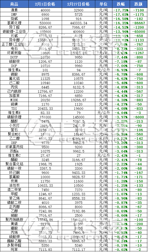 原油下行外加下游需求不足,多種原料出現(xiàn)波動情況。共有57種化工大宗下跌,占大宗榜的52%!詳情且看下表: