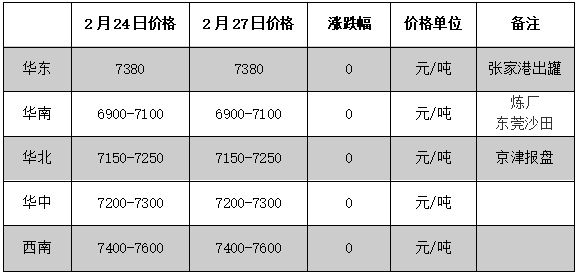 2月27日,原油收盤繼續(xù)上漲,利好甲苯市場,然下游需求跟進有限,華東市場盤整為主,業(yè)者心態(tài)謹慎;華南地區(qū)主營煉廠報價暫穩(wěn),市場暫穩(wěn)整理。華東市場價格在7380元/噸,環(huán)比持穩(wěn);華南市場價格在6900-7100元/噸,環(huán)比持穩(wěn)。