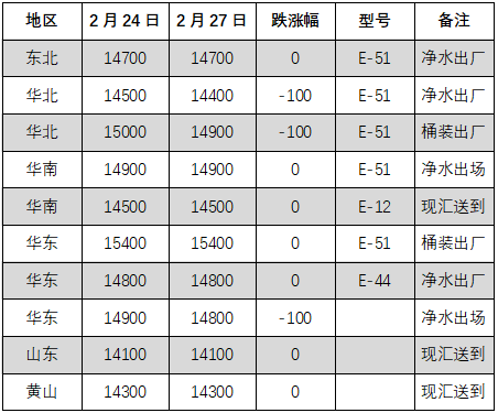 2月24日,環(huán)氧樹脂市場重心下行探底整理,上游雙原料小幅波動,樹脂成本面波動不大,場內(nèi)活躍度一般,下游需求暫未改善,實單交投寥寥。