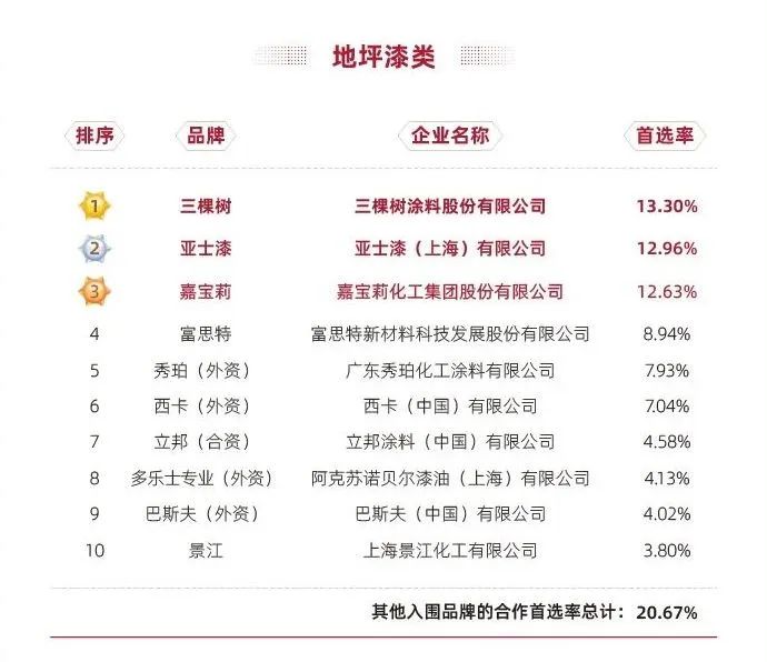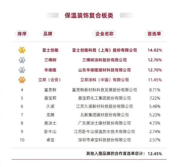 憑借三棵樹綠色建筑六位一體系統的優勢,三棵樹地坪漆類居榜單首位,保溫裝飾復合板類、建筑防水材料類也榮登TOP榜單前五,為房企和消費者選用和采購誠信供應商提供具有權威價值的參考標準。