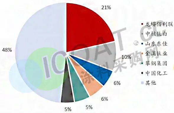 龍佰集團(tuán)是唯一一個(gè)年產(chǎn)能超過60萬噸的企業(yè),年產(chǎn)10萬噸鈦白粉以上的企業(yè)還包括攀鋼鈦業(yè)、中核鈦白、中國(guó)化工、山東東佳、金浦鈦業(yè)、金海鈦業(yè)、寧波新福、山東道恩鈦業(yè)、廣西金茂鈦業(yè)和云南大互通等。此外,我國(guó)有將近20家鈦白粉生產(chǎn)企業(yè)產(chǎn)能位于5-10萬噸/年之間,產(chǎn)能小于5萬噸/年的企業(yè)多達(dá)16家,另有部分小產(chǎn)能處于停產(chǎn)狀態(tài)。可以說整個(gè)行業(yè)的產(chǎn)能多集中在頭部企業(yè)身上,這也穩(wěn)固了頭部企業(yè)的話語權(quán)。