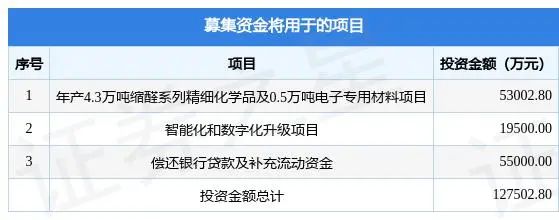近日,安徽新遠科技股份有限公司(簡稱:新遠科技、公司)IPO申請獲上交所受理,擬登陸主板。募資總金額為12.47億元,保薦機構為中信建投證券股份有限公司。募集資金擬用于年產4.3萬噸縮醛系列精細化學品及0.5萬噸電子專用材料項目、智能化和數字化升級項目、償還銀行貸款及補充流動資金,詳見下表: