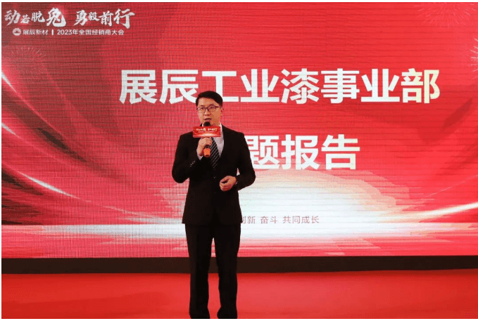 工業漆事業部總經理張君先生,分享了展辰工業涂料逆風飛揚的成長歷程,介紹了產品體系、應用領域與項目案例,對2023年的形勢與機會進行了分析,從平臺、產品、渠道、市場等方面進行了全面的分享,號召經銷商伙伴們堅持長期主義,在工業涂料的廣闊天地里創造星辰大海!