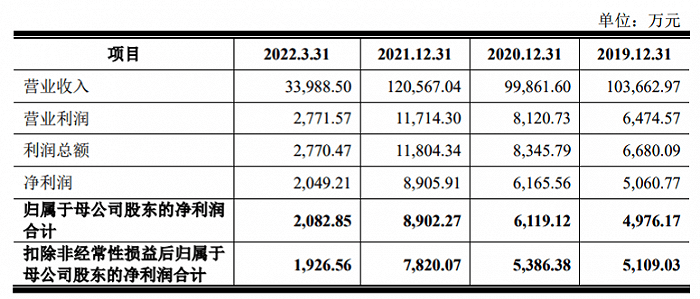 數據顯示,2019年、2020年、2021年、2022年一季度公司營收分別為10.37億、9.99億、12.6億、3.4億,歸母凈利潤分別為0.5億、0.61億、0.89億、0.21億,其中,2020年、2021年歸母凈利分別大幅增長22.97%、45.48%。