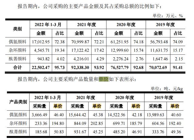 具體來看,偶氮顏料、雜環(huán)顏料是公司第一、二大業(yè)務,2022年一季度, 偶氮顏料、雜環(huán)顏料及酞菁顏料等主要產品金額占采購總額比例分別為72.38%、19.34%、4.02%。
