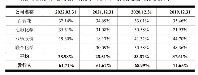 資產負債率方面,2019年至2022年一季度,以百合花、七彩化學、雙樂股份、聯(lián)合化學為代表的同行企業(yè)平均資產負債率分別為37.61%、33.87%、28.51%、28.98%,而公司報告期內資產負債率分別為71.65%、68.99%、61.67%、61.71%,雖然三年來下降了9.94%,但還是遠高于行業(yè)均值,而本次公司擬募集資金中的1億元將用于償還債務。