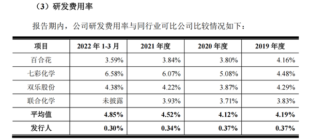 為何公司與行業(yè)研發(fā)投入的走勢背道而馳?公司表示,主要原因為公司是以產品開發(fā)、品質管理、供應鏈整合和全球銷售網絡布局為核心競爭力的著色劑專業(yè)供應商,發(fā)行人的研發(fā)活動主要集中于產品開發(fā)、檢測技術的研發(fā)等,公司研發(fā)特點與同行業(yè)可比公司存在較大差異。