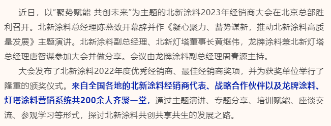 新征程時不我待,新使命催人奮進。2023年,北新涂料人將一如既往地與廣大經銷商合作伙伴一道努力,凝心聚力、互相賦能,為中國涂料工業的發展,為中國自主高端品牌的打造努力奮斗。