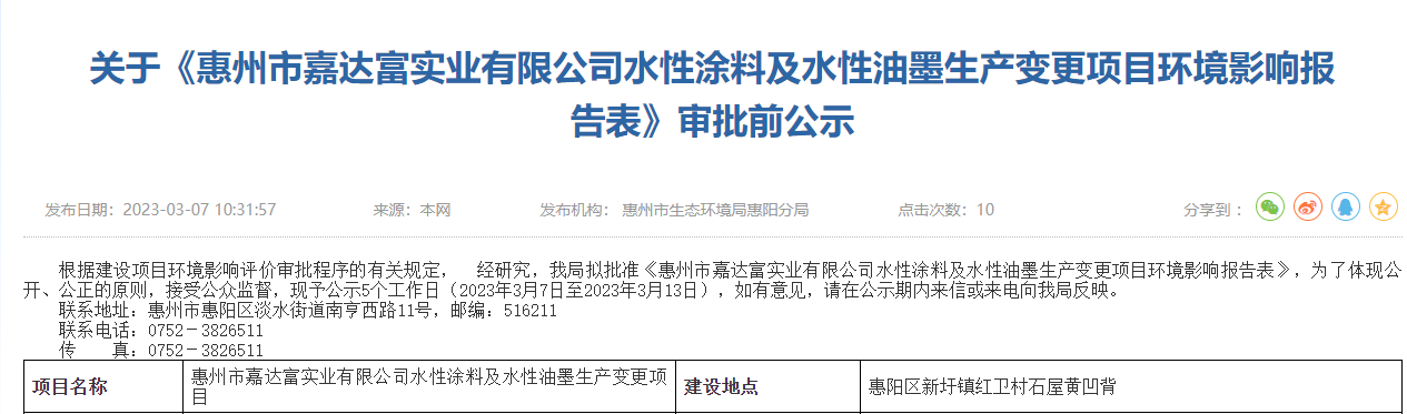 近日,廣東省惠州市生態環境局惠陽分局發布關于《惠州市嘉達富實業有限公司水性涂料及水性油墨生產變更項目環境影響報告表》審批前公示。