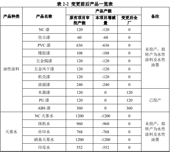 項目概況:項目位于惠陽區新圩鎮紅衛村石屋黃凹背,投資500萬元,在現有項目內進行,原環評審批的油性涂料和天那水共計16764噸/年,現投產4968噸/年,其余未投產的11796噸/年產品變更后不再生產,轉產為水性涂料及水性油墨產品,轉產后年產水性涂料8000噸/年,水性油墨1500噸/年。