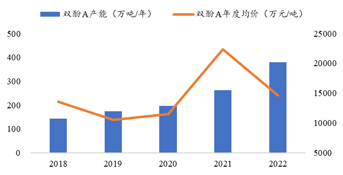 2018-2022年中國(guó)雙酚A產(chǎn)能與價(jià)格變化