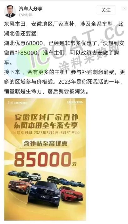 除湖北地區外,在貴州、云南及安徽等地的東風本田也開啟了“全系車型限時直補”,貴州、云南區域的廠家雙補最高至6萬元,而安徽區域最高達8.5萬元。