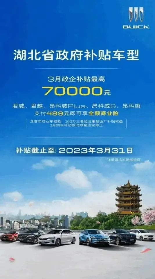 上汽通用旗下別克也宣布加入了湖北地區“補貼降價”大軍,截止至3月31日,政企補貼最高7萬元,君威、君越、昂科威Plus、昂科威S、昂科旗等車型,均享有補貼資格。購車者只需要支付499元,即可享受全額商業險,包括首年商業車損險,100萬三者險及返廠補貼權益,送完即止。