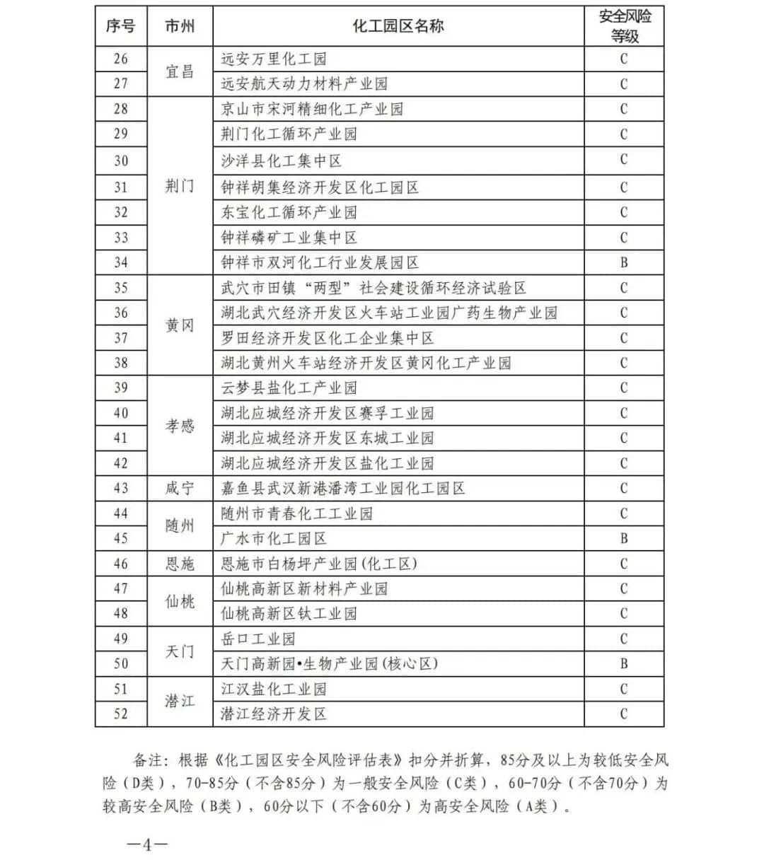 經綜合評估,確認武漢化學工業區等48個園區安全風險為C級(一般安全風險),鐘祥雙河化工行業發展園區、石首張城垸化工園區、天門高新園•生物產業園(核心區)、廣水市化工園區等4個化工園區安全風險等級為B級(較高安全風險)。