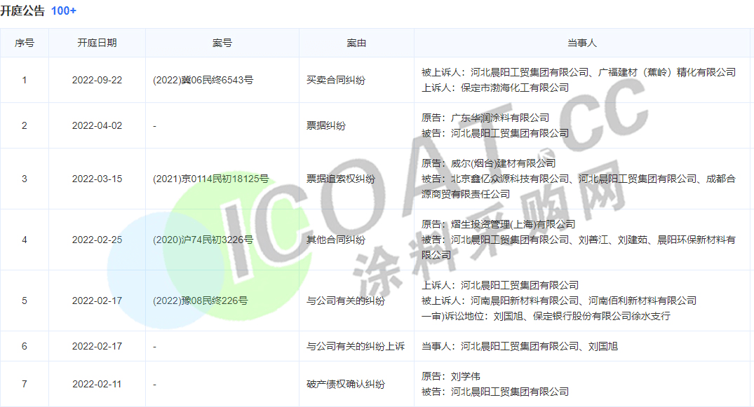 網絡部平臺顯示,晨陽水漆裁判文書涉及171項,僅2022年內就有7項,其中包括買賣合同糾紛、票據糾紛、民間借貸糾紛、服務合同糾紛、票據追索權糾紛、財產保險合同糾紛等。