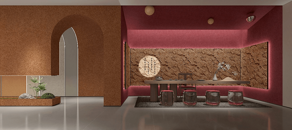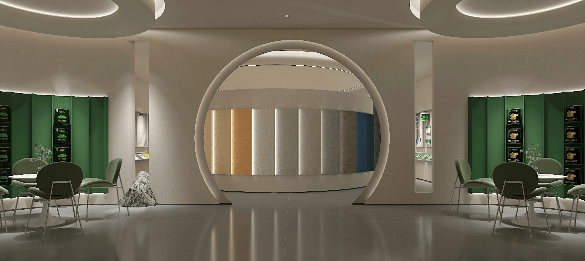 展廳整體空間設(shè)計(jì)的靈感來源于對(duì)三棵樹企業(yè)文化的核心、老子的“道法自然”哲學(xué)的領(lǐng)悟,設(shè)計(jì)團(tuán)隊(duì)巧妙地運(yùn)用了代表自然與包容的同心圓,利用同心圓在空間布局中靈活的運(yùn)用,營(yíng)造出靈動(dòng)的空間布局及墻面展示,充分展現(xiàn)了三棵樹藝術(shù)涂料的美及特性,賦予空間獨(dú)特的藝術(shù)之美。