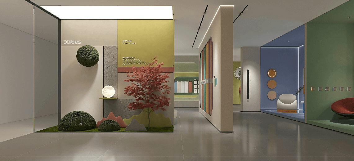 展廳設(shè)計(jì)中采用簡(jiǎn)單的幾何體量,無裝飾的立面造型,縫隙窺視的即時(shí)感,以小見大,闡述了一種新的空間氛圍,為自由流動(dòng)的空間性格奠定了基礎(chǔ)。半開放式的布局,不同類型的三棵樹藝術(shù)漆、綠色植物和空間的穿插,融入了三棵樹品牌對(duì)人與自然關(guān)系的探索與思考。
