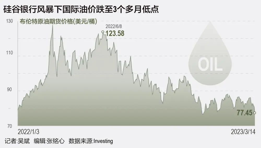 在硅谷銀行倒閉風(fēng)暴、油市供應(yīng)過(guò)剩等因素的沖擊下,國(guó)際油價(jià)遭受重挫。3月14日,國(guó)際油價(jià)大跌逾4%,創(chuàng)下三個(gè)多月新低,15日,WTI原油期貨盤中一度跌破70美元,創(chuàng)下14個(gè)月新低。16日,WTI 4月原油期貨收跌5.22%,盤中一度暴跌近8%,收?qǐng)?bào)67.61美元/桶,自2021年12月以來(lái)即月合約首度收盤跌破70美元。布倫特5月原油期貨收跌4.85%,報(bào)73.69美元/桶,創(chuàng)2021年12月以來(lái)收盤新低。