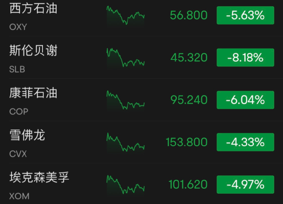 油價(jià)周內(nèi)累計(jì)跌超10%,能源股也受拖累全線下跌,埃克森美孚跌4.97%,雪佛龍跌4.33%,康菲石油跌6.04%,斯倫貝謝跌8.18%,西方石油跌5.63%。
