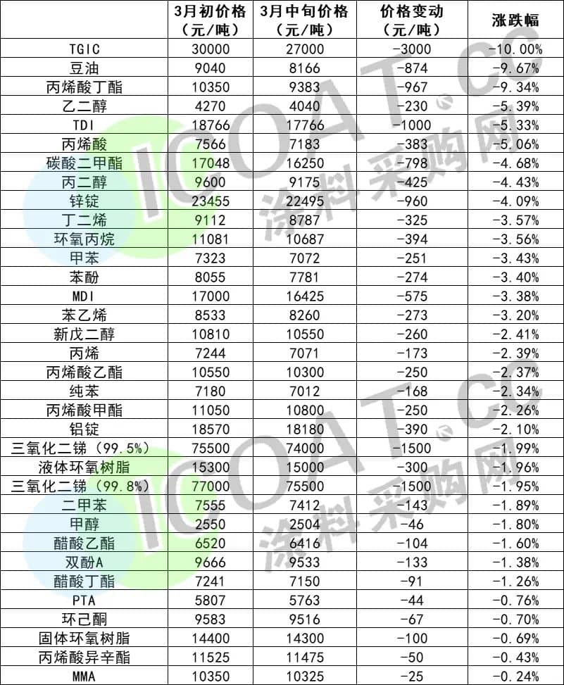 TGIC3月中旬報價27000元/噸,較3月初價格下跌3000元/噸,跌幅10.00%;