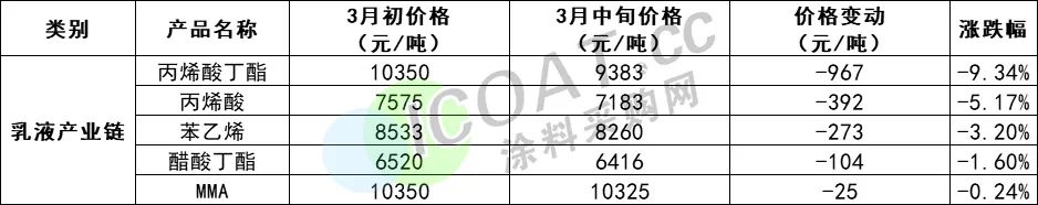 在乳液產業鏈,丙烯酸丁酯價格下跌967元/噸,跌幅近10%。丙烯酸、苯乙烯、醋酸丁酯單噸報價下跌百元左右。