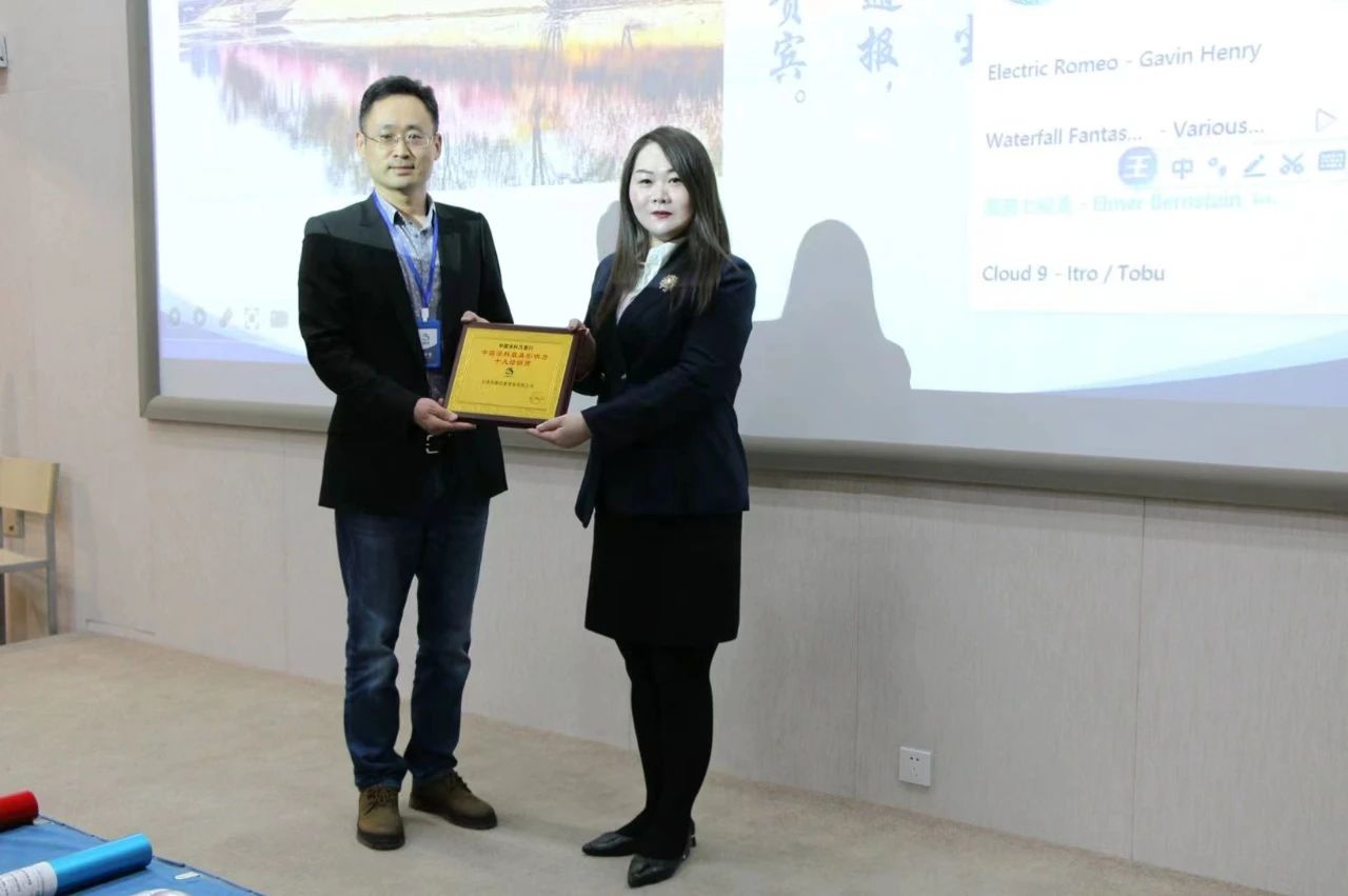 涂料采購網總監江雪為天津尚德信嘉總經理張有祥頒發“2022年度十大供應商獎牌”
