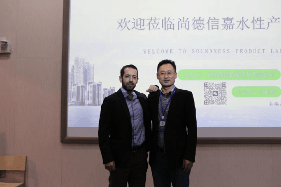 尚德信嘉總經理張有祥(右)與DIC彤德樹脂項目組成員 Alejandro Gran(格燃)(左)合影