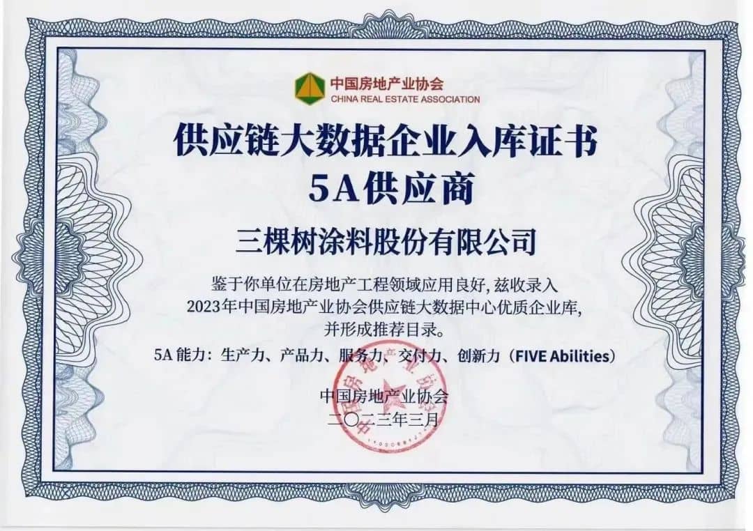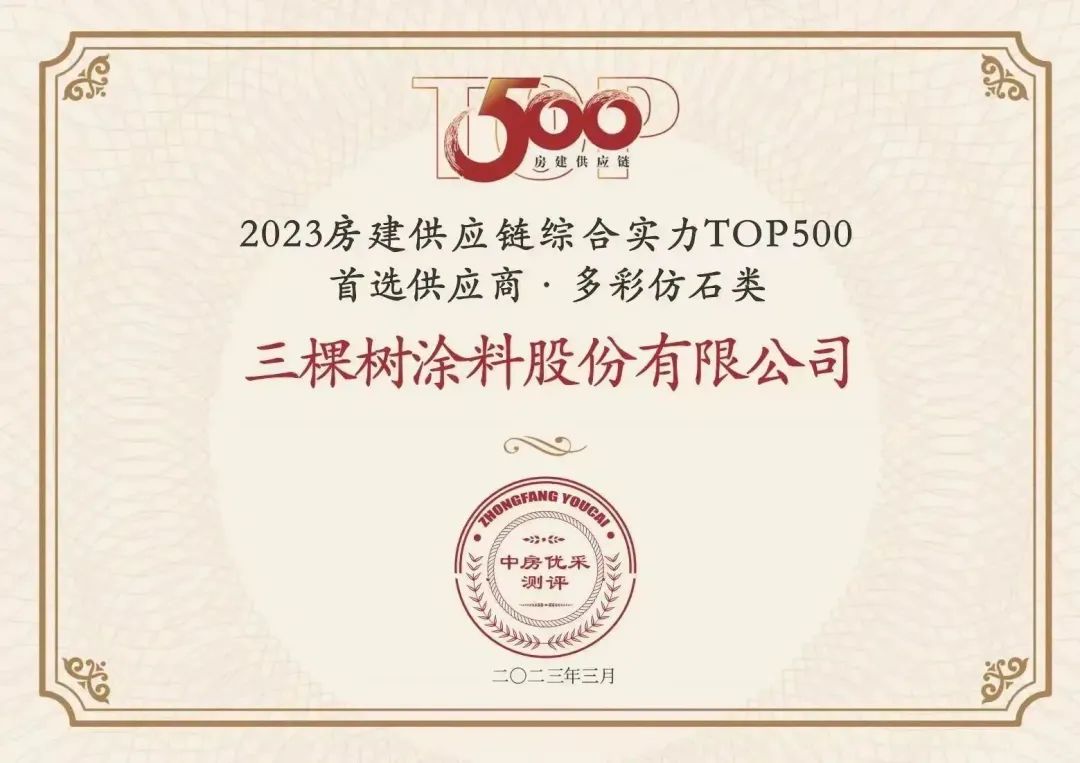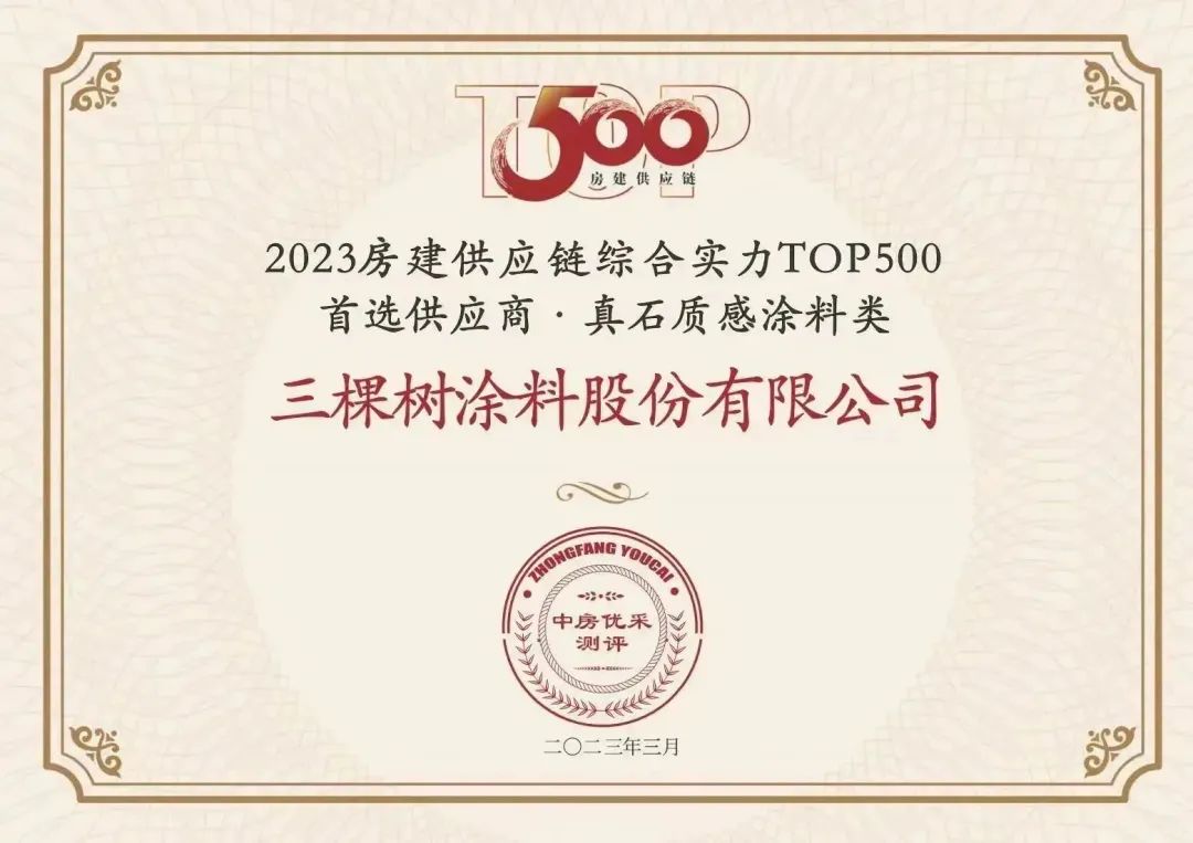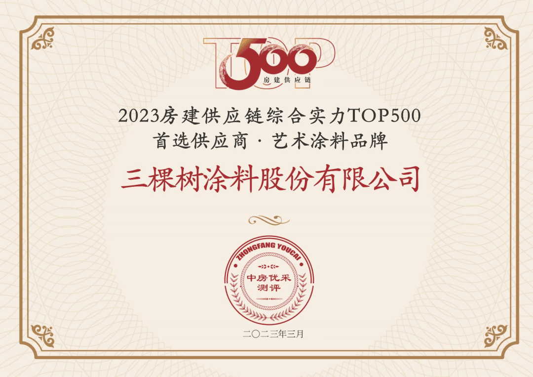 3月23日,《2023中國房地產開發企業綜合實力TOP500測評研究報告》發布,三棵樹憑借強勁的品牌實力、綠色創新產品及優質服務口碑,實力入選“2023房建供應鏈綜合實力TOP500強首選供應商”榜單,榮膺“工程外墻類民族品牌”“多彩仿石類”“真石質感涂料類”“藝術涂料品牌”“真石漆類”“高端仿石漆(水性含多彩)”“涂料裝飾保溫一體板(雙包)類”六項榜單位列第一,同時在其他細分類榜單中入圍并獲得優異排名,成為建筑涂料行業中國民族品牌的領頭羊。