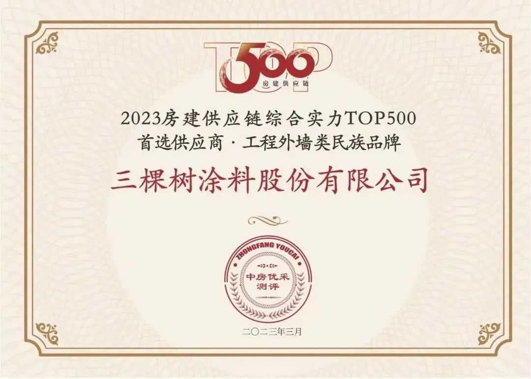 而此次,據《2023中國房地產開發企業綜合實力TOP500測評研究報告》顯示,三棵樹斬獲“工程外墻類民族品牌”第一的榮譽,印證了三棵樹的戰略發展方向的正確性。