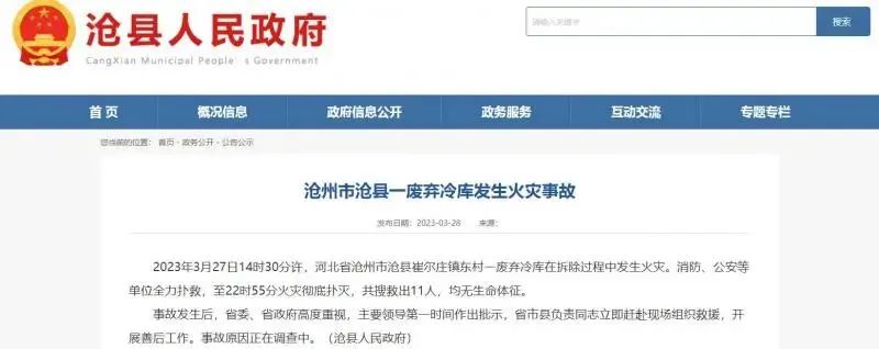 昨日(3月28日),河北滄州市滄縣人民政府發(fā)布通報(bào):3月27日14時(shí)30分許,河北省滄州市滄縣崔爾莊鎮(zhèn)東村一廢棄冷庫在拆除過程中發(fā)生火災(zāi)。消防、公安等單位全力撲救,至22時(shí)55分火災(zāi)徹底撲滅,共搜救出11人,均無生命體征。