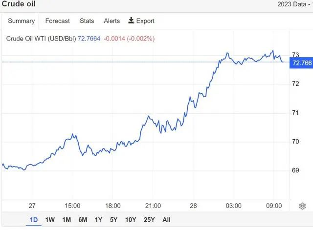 本周一,布倫特原油期貨價格收漲3.13美元,至每桶78.12美元,漲幅4.2%。美國WTI原油期貨收漲3.55美元,至72.81美元,漲幅5.1%。