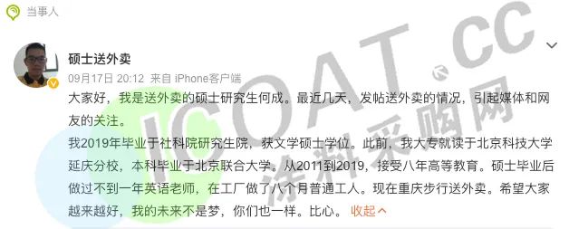 不久之前,一位畢業于中國社會科學院研究生院的碩士研究生送外賣的案例,引發了熱議。當事人表示,畢業之后當過一年的英語老師,還在工廠里打過工。但是一直“沒有找到合適的工作,需要養活自己”,無奈之下選擇送外賣。