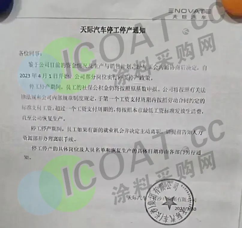 近日,前身為樂視汽車的天際汽車發布通知稱,鑒于公司目前的資金情況及生產與銷售計劃,自2023年4月1日開始,公司部分崗位實行停工停產政策。