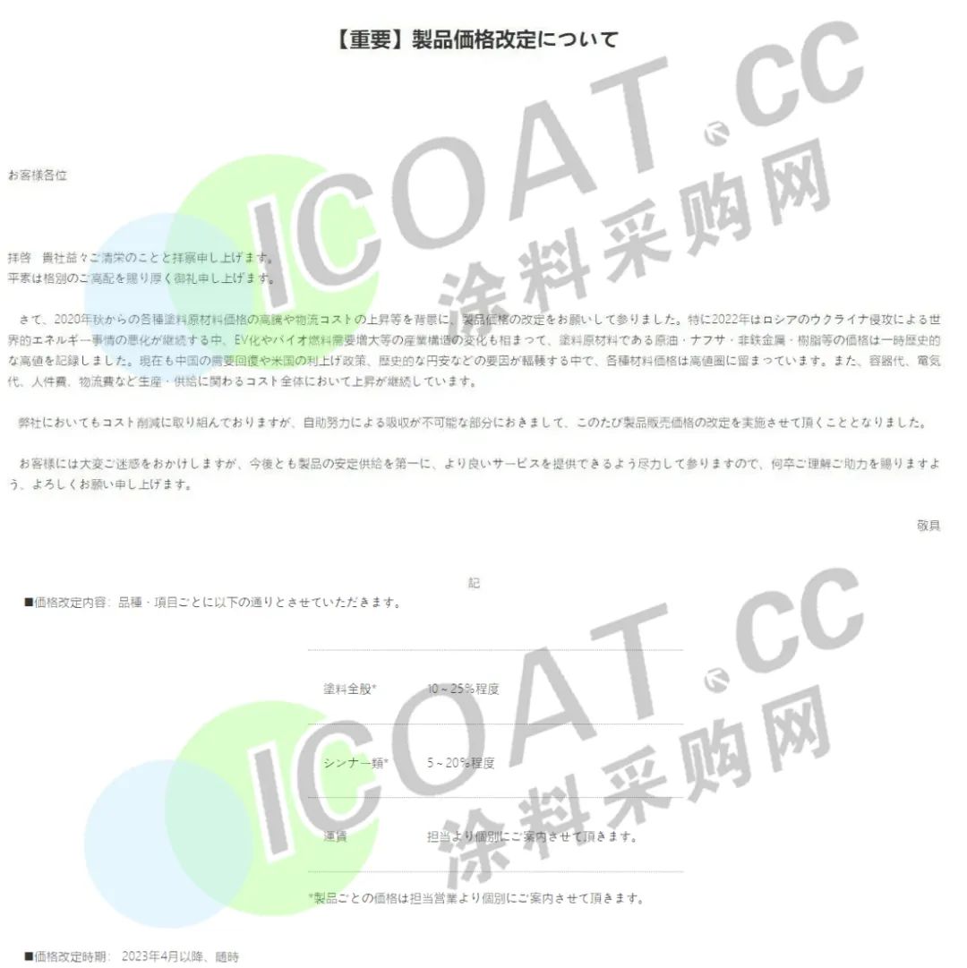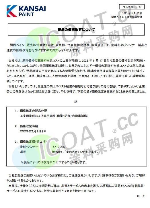 而在此前,關西涂料發布公告,將對工業涂料和通用涂料(建筑涂料、防腐蝕涂料、汽車修補漆)產品價格上調5%-20%。
