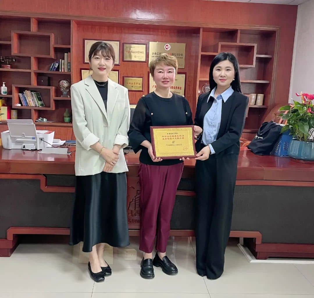 涂料采購網(wǎng)總監(jiān)王賽(右)、市場部經(jīng)理王倩(左)為駿能化工創(chuàng)始人徐佳(中)頒發(fā)“2022年度十大優(yōu)秀供應(yīng)商”牌匾