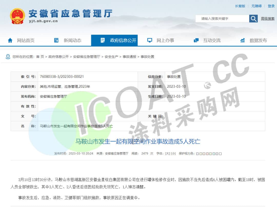 2023年3月10日,馬鞍山市慈湖高新區安徽金星鈦白集團有限公司發生中毒窒息事故,因施救不當先后造成6人被困罐內,造成5人死亡、1人受傷。