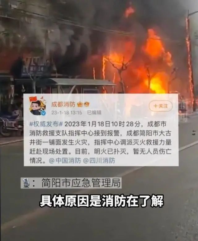 2023年1月18日,成都簡陽一油漆店發生火災,現場濃煙滾滾,并傳出爆炸聲。