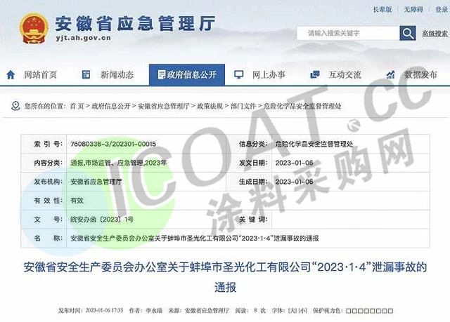 2023年1月4日,安徽省蚌埠市圣光化工有限公司發生混酸(硫酸和硝酸混合物)泄漏事故,事故未造成人員傷亡,但造成較大社會影響。