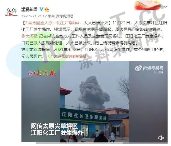 2022年11月21日,山西太原尖草坪區江陽化工廠發生爆炸,傷亡情況暫未得到消息。